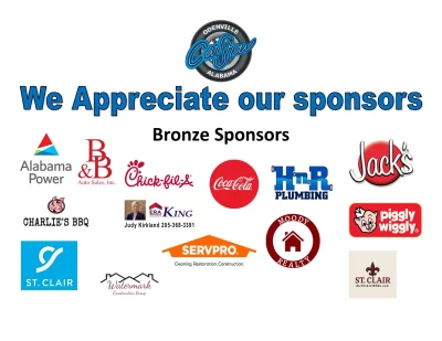 Thank you to our Sponsors: Premiere Sponsor - City of Odenville | Corporate Sponsors: adr Business & Marketing Strategies, Alabama Power, ALFA Insurance Moody, All American Ford, America's First Federal Credit Union, Cayce Wilson State Farm, Exit Coosa River Realty, Katering 101, Metro Bank and Union State Bank. | Business Sponsors: B & B Auto Sales, Inc., Calvary Baptist Church, Emerald Valley Inspection Services, ERA King Real Estate Company, Kinetic, Kristi Graham Scott Loan Officer NMLS 1734162, Revolution Roofing, Ridgeline Roofing, Stocks Broadcasting, Inc. and Wright's Removal & Clearing Services.